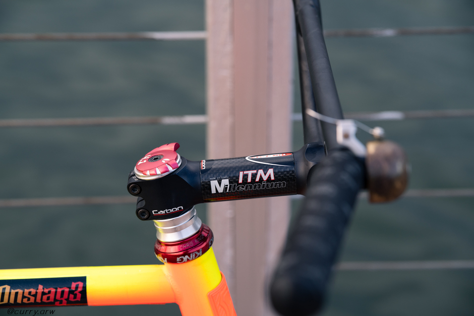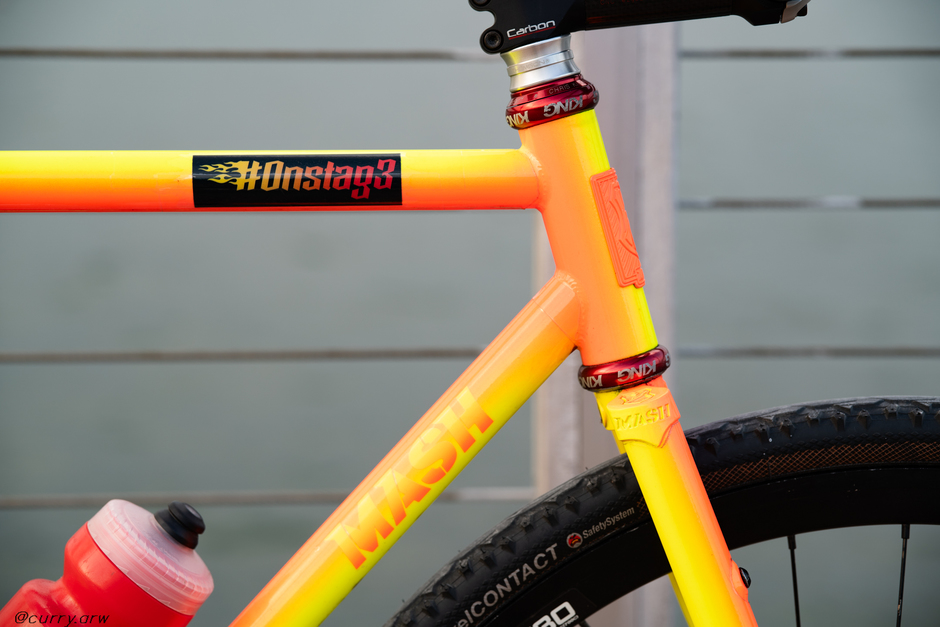 fairweather corner framebag (not shown), crane bell, spurcycle ketchup and mustard bidons, minoura dura cage, thomson spacers.