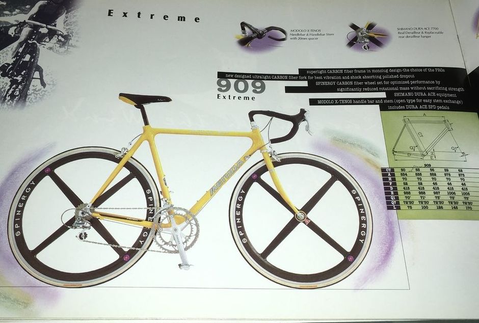 This is my Merida Extreme 909 in original team yellow, with full Dura‑Ace 7700 and Spinergy Rev‑X, as shown in the late‑90s Merida catalogue. I am looking for more detailed information, geometry charts and high‑quality scans or PDF of the original catalogue pages for this model. Any help or links would be greatly appreciated.