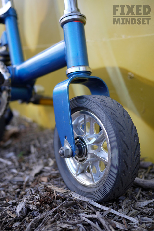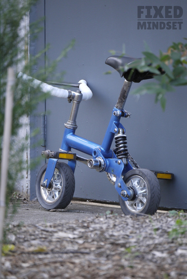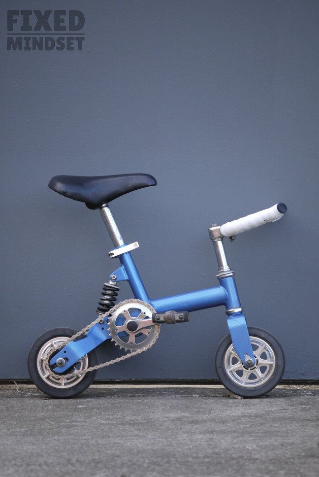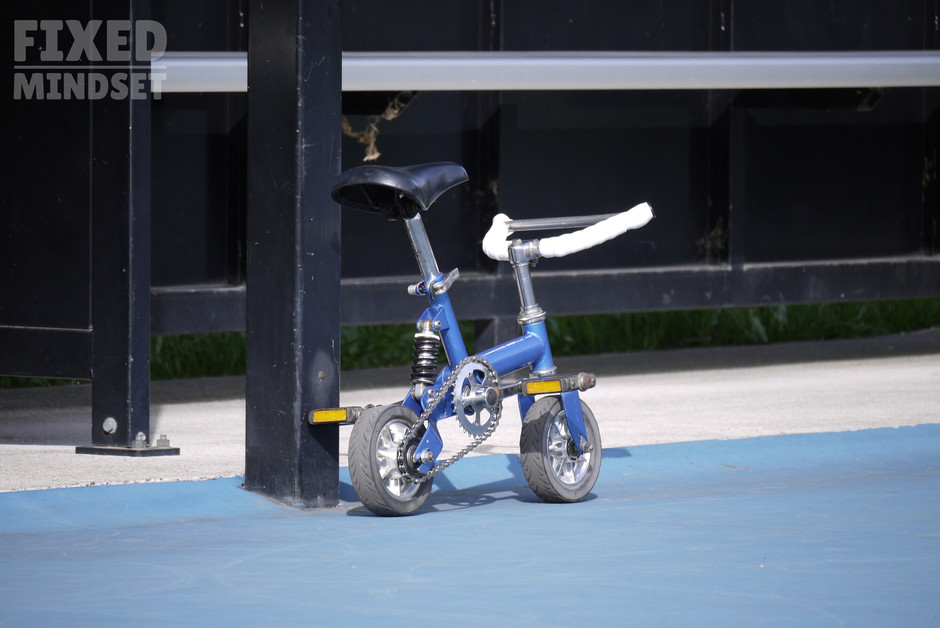 Mikro-Bike rebuilt as a fixed gear. It's a very funky contraption with tiny dimensions: both top tube and seat tube measurements are approximately 190mm. The ratio is an equally diminutive 26/16. I believe the Mikro-Bike was sold in the UK by Wicked Vision around 2001. Enjoy #fixedmindset