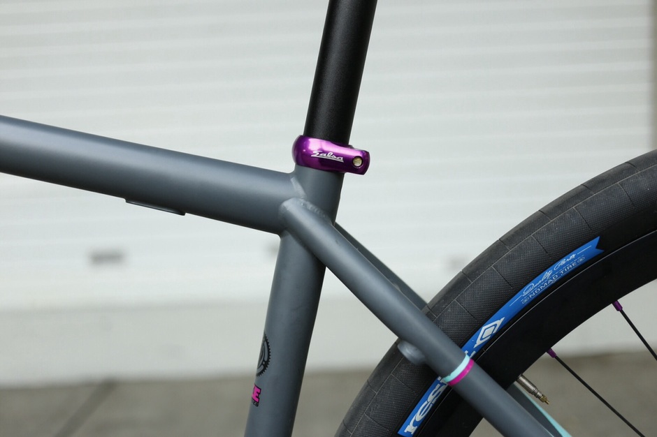 Velocity Chukker 36h Non-Machined Black Rim / Profile Track Fixed-Free Purple Rear Hub / Resist Nomad All Black Tire 700x45c / DT Champion Black Spokes / Wheel Smith Purple Nipples / Velox Rim Tape 22mm.