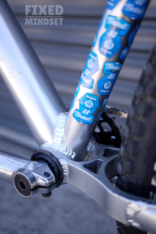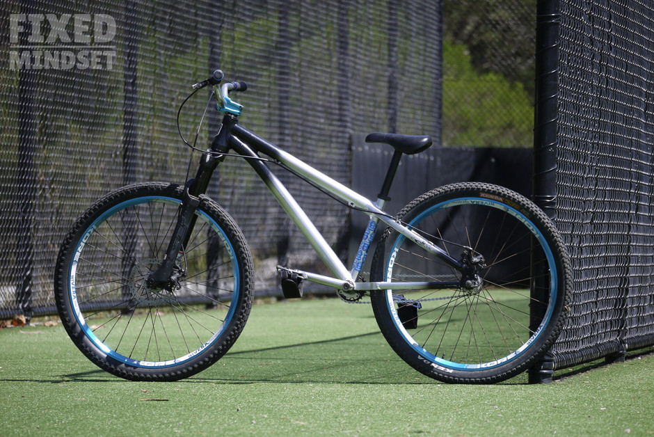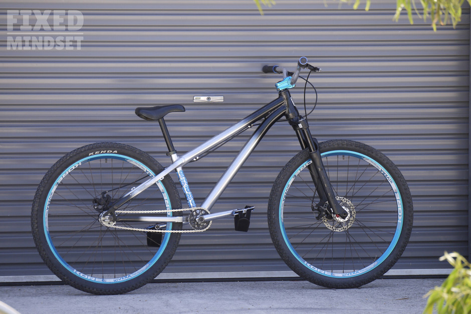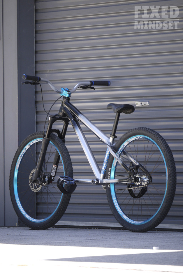 A simple dirt jumper fixed gear build with a flipped rear and reversed axle spacers to sort out the chainline. Barring the Marzocchi Bomber DJ fork, the bike is largely original and complete with some decent battle scars. Running a huge 25:16 ratio ️