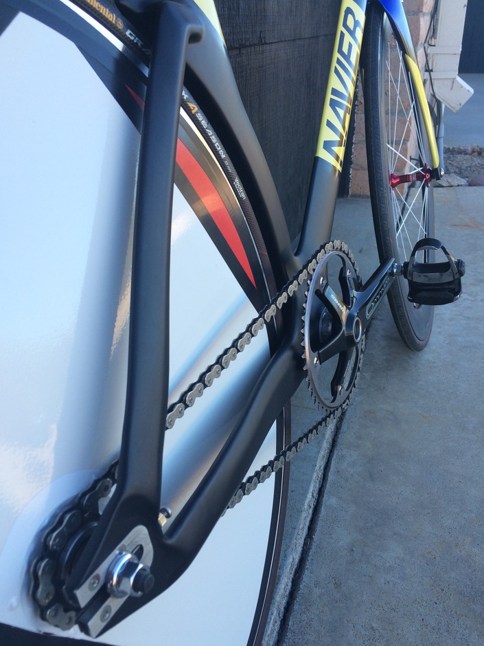 NS Bikes: Fixed gear time trial bike for hour record & cadence training. Powered by F.R.E.D. technology, Friction Reducing Endurance Design. This was a rattle-can job with automotive paint+clear coat and lots of sanding.