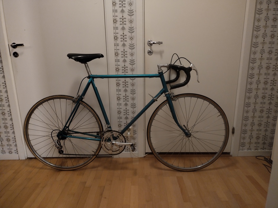 Bike of unknown origin, professionally painted with a Lamborghini green. Bought it off of an aquaintance for 500SEK, stripped it of unnecessary crap and rebuilding it with spare parts. Going to run it as a gravel/touring bike