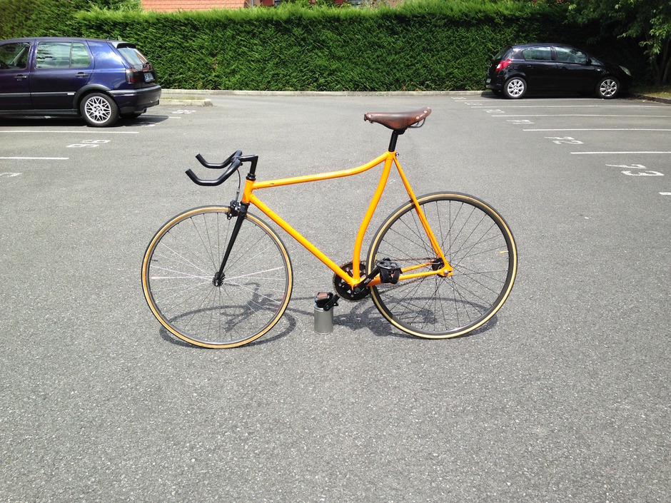 I bought that 80's frame+front wheel+fork 7 years ago from bike club in Poland, it had no dents or rust, i will post old picture later. Mr. Gromada renovated it, he narrowed back triangle and changed rear forkend. I put it together last season (2015) as my dream bike, drove less than 50km, never during rain, but after knee injury I have to quit riding fixies :( If you see any dust on pics - that's because it was standing in my room whole winter, it really looks and feels as new. If anyone is interested in buying it - let me know. This baby is located now in Saint-Genis-Pouilly, 5 minutes from Geneve, on French side. Contact me via facebook, or gmail: facebook.com/galaskajetan kajetangalas+fixie@gmail.com