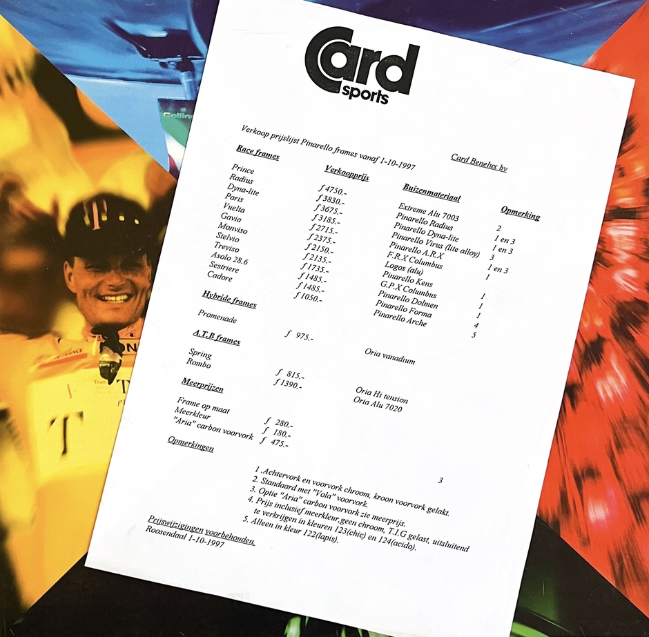 This 1997 Pinarello Vuelta came into my life in 2010—or perhaps I came into its. It was virtually untouched, acquired from its original owner who had ridden it only sparingly. A rare encounter. In the Netherlands, very few Vueltas were ever sold; over the years, only a handful have surfaced—no more than one could count on a single hand. At the time, the roads were dominated by the Gazelle Champion Mondial. Not merely out of preference, but out of proximity: Gazelle dealers were everywhere, in every town and city, while Pinarello remained a rarity. Meanwhile, a quiet revolution was unfolding—aluminum was on the rise, and steel was gradually pushed aside, cherished mainly by purists and those reluctant to let go of what had long proven its worth. And yet, the steel of that era stood at its peak. Refined, resilient, almost indestructible. Names like Columbus, Reynolds, and Dedacciai became synonymous with innovation and craftsmanship; their alloys gave steel a renewed soul. In 1994, steel wrote its final chapter in the Tour de France. A Pinarello Dyna, built from Dedacciai 18MCDV6ht and welded by the legendary Dario Pegoretti, rode to victory. That same spirit lives on in this Vuelta. Where the Dyna and Radius express themselves through clean TIG welds, the Vuelta proudly carries its traditional lugs—an echo of another era. In 1997, it stood as the most expensive lugged frame in Pinarello’s lineup. But above all, it is a bicycle from a moment of transition—a quiet monument to steel, craftsmanship, and change.