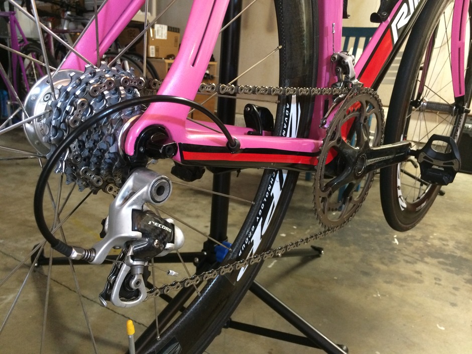 Fabric bar tape. Two carbon bottle cages. K-edge garmin mount and chain catcher