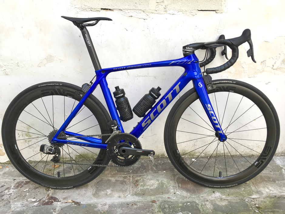 Candy blue Scott Foil 15 frame & forks updated with modern aero parts and some 3D printed bits.