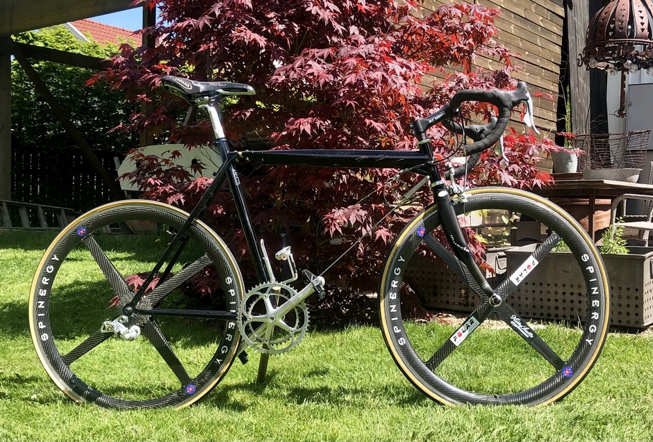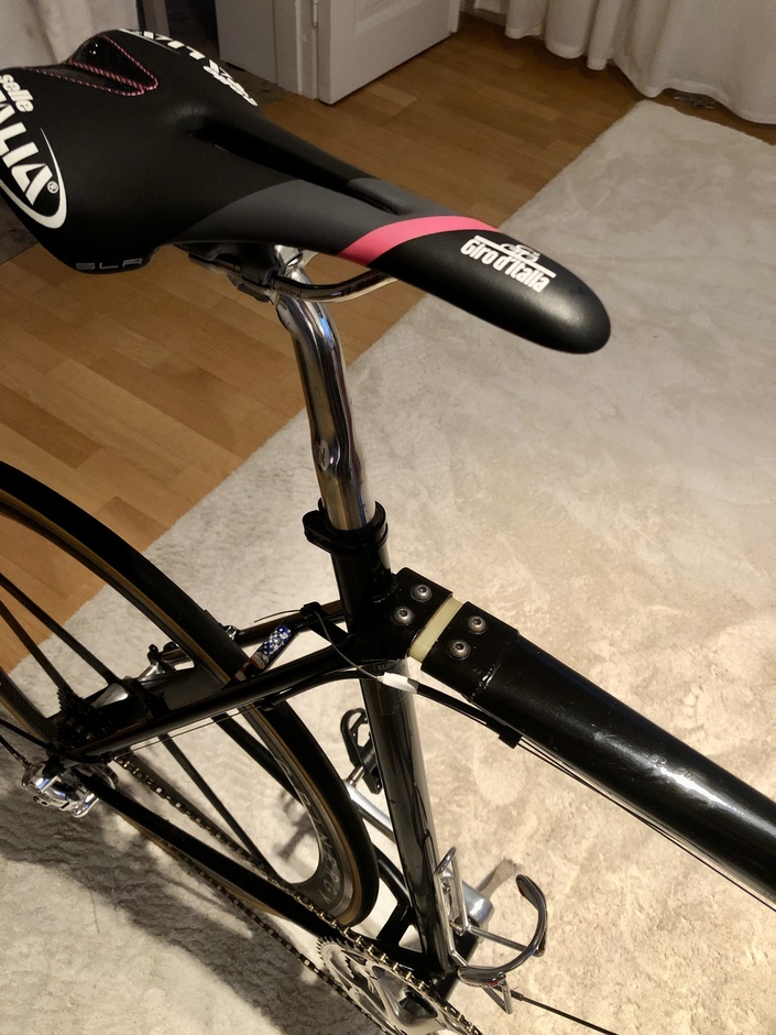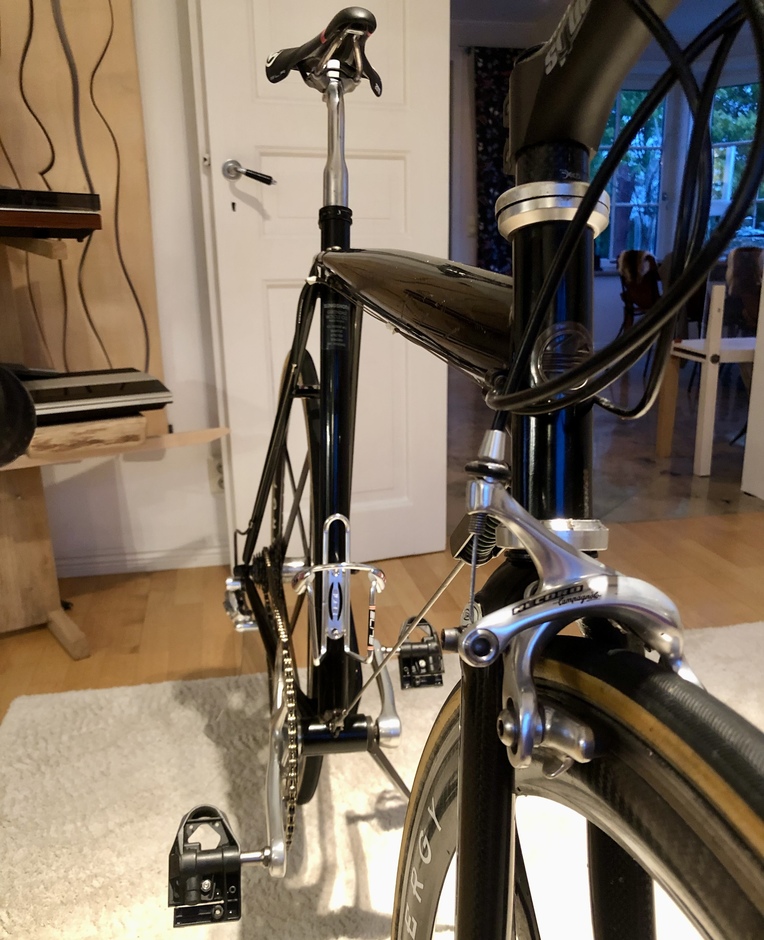 Just got the frame. It has a bad crack around the BB which has to be welded. New paintjob and I Will build the Mtb frame up as a roadbike. Campy parts mixed with shimano 11 sp shifters is planned. Usage Will be nostalgic triathlon racing and Travelling as it folds easily. New paint yellow? Black? Green?