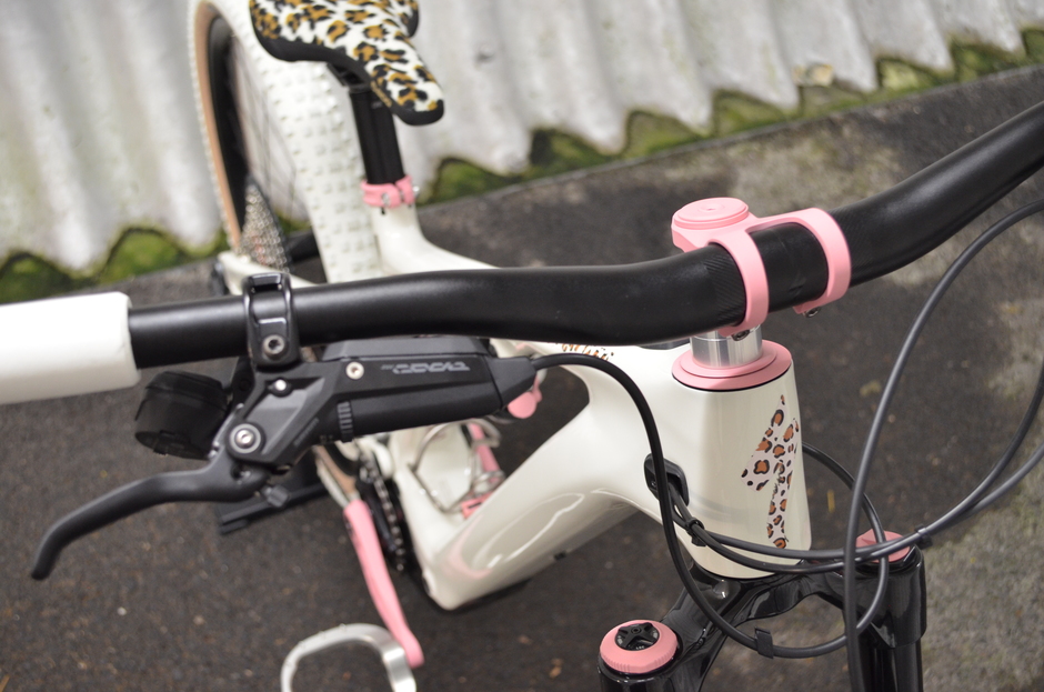 Custom Cerakote coated parts by Dreier Cycles: Intend Stem, Cascade rocker link, linkage bolts, BetterBolts aircap, Fox grip2 ajuster, Hope seatclamp, spacer, topcap, topcapbolt, headsetcover, 5Dev crankarms.