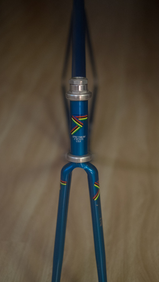 Spectrum cycles pursuit frame. 1996 with a very subtle turquoise to blue fade along its length. Hand made lugs and built by Tom Kellog