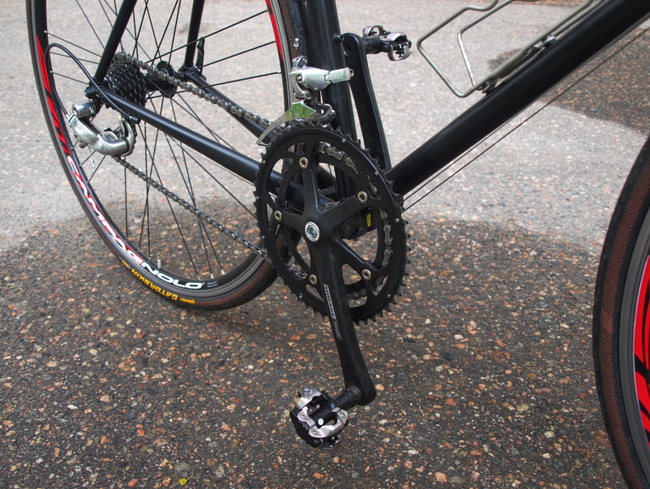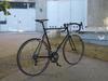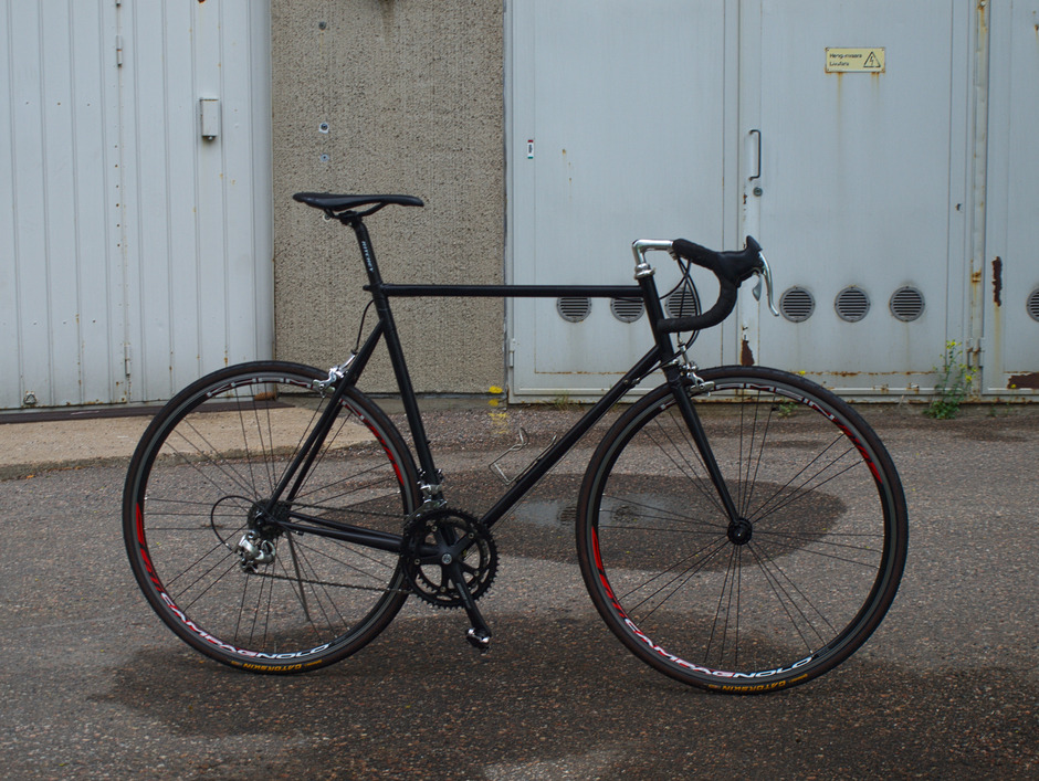 Black road bike from an unknown maker, Ritchey dropouts, weighing a bit over 10 kg. If you have any idea about the brand of the bike, please comment. None of the parts are original, so only clues are the shape of the frame and the Ritchey-dropouts.