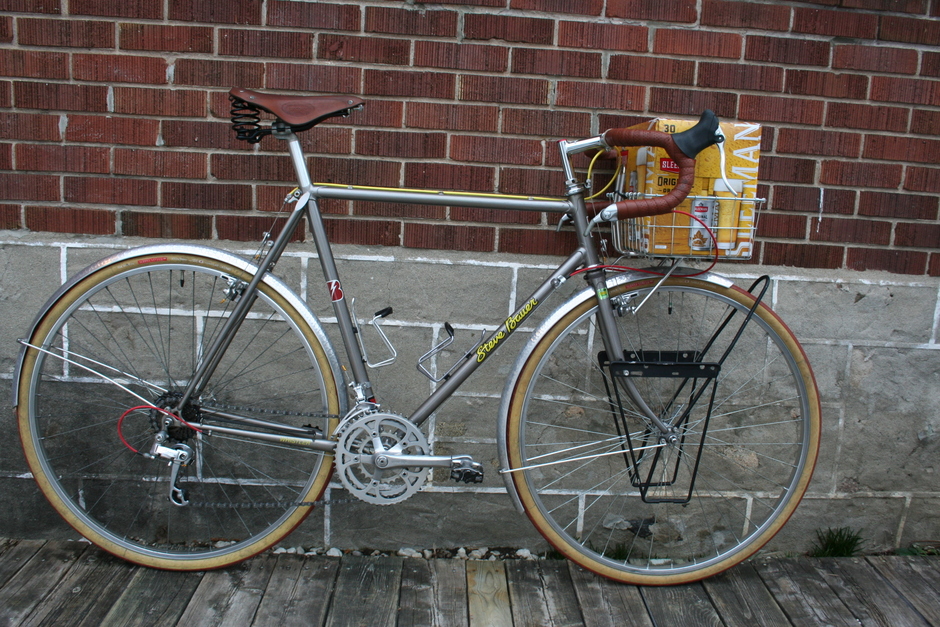 Steve Bauer Whistler touring bike. I have never found or seen another Steve Bauer Whistler before, but this is a very well made, unique bike!! 57cm seat tube with a nice short 55cm top tube. Sooooo many tasteful upgrades to this sweet ride. 90mm Sim Works "Gettin' Hungry" steel stem clamping 490mm Nitto drop bars that are all wrapped up in Brooks Honey Tape. Awesome Brooks Flyer Special saddle in honey. Velo Orange front rack with basket and VO hand hammered fenders make this a tasty build. Tange 900 double butted chromoly tubes. Soma 700x33c tires, 7x3 drive train with Dura Ace bar end shifters.