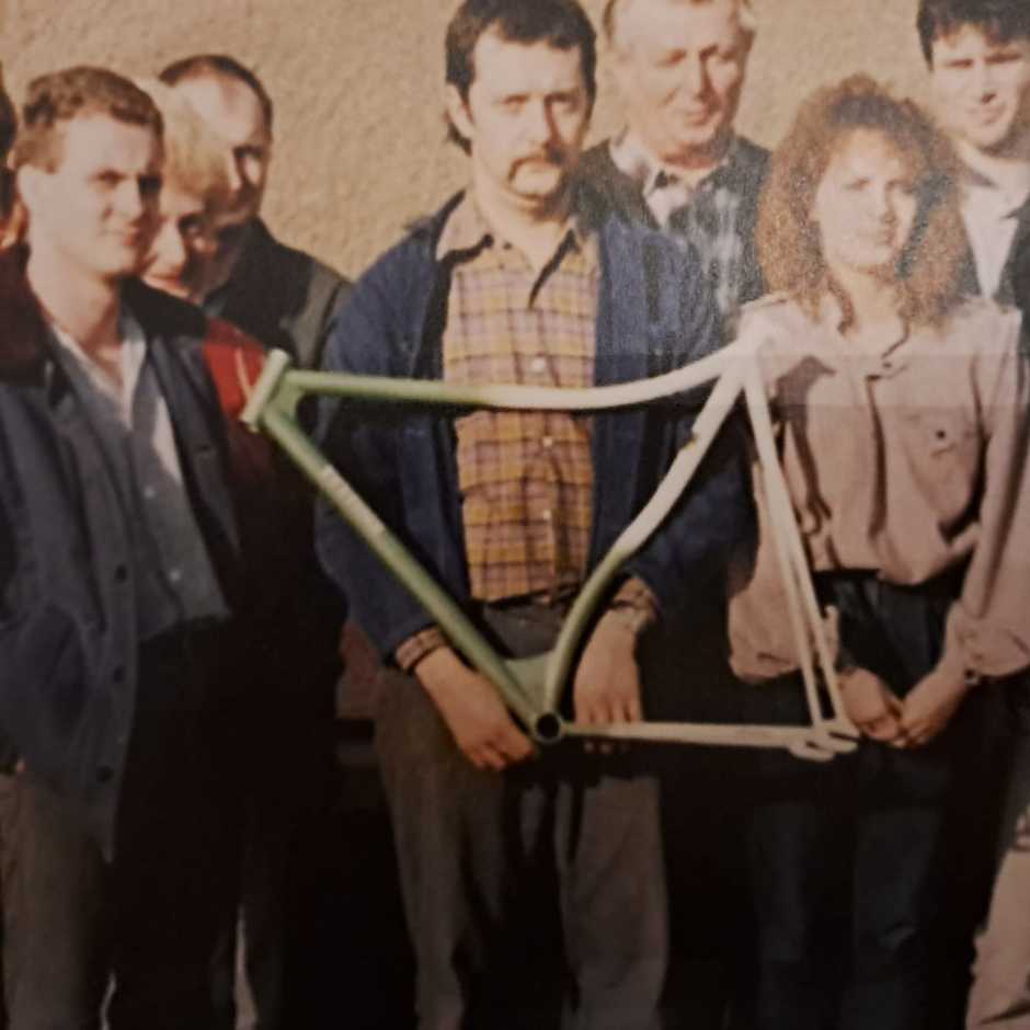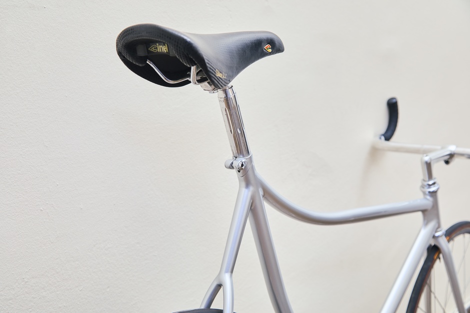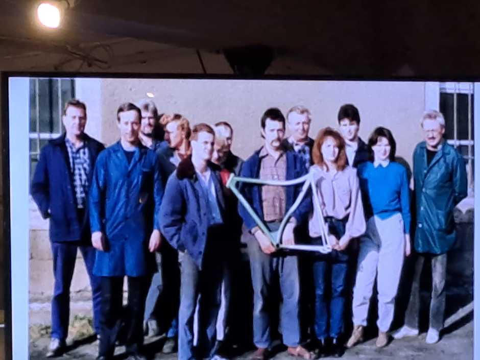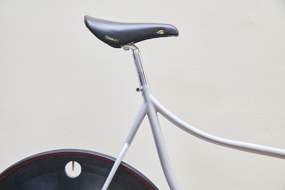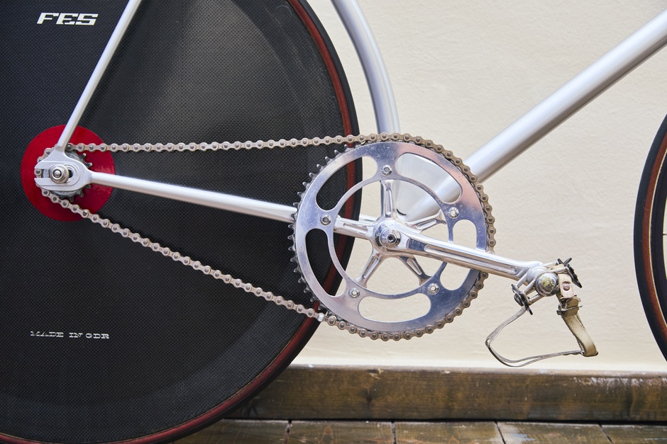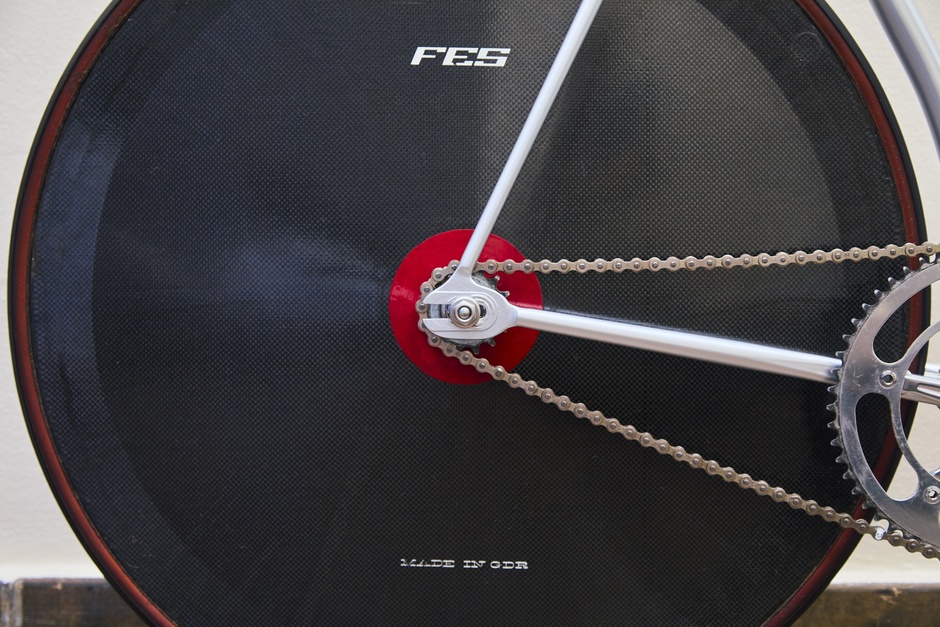 Textima Type Pursuer 27/24 – a very special Textima model from 1990 representing the final development stage and a prototype. Firstly, because not only the seat tube but also the top tube is curved. Secondly, because the reinforcement plates were added later. What does that mean? It means that this test model was used to investigate the effect of such reinforcement plates on the bending and torsion of the frame. First, the frame was measured without plates, then the tunnel plate was added to the bottom bracket. Finally, a measurement was taken with the tunnel plate and head tube plate. The result showed that the additional plate on the head tube could not make a significant contribution to reducing the bending and torsion of the frame. There was also a comparison model that was almost identical in construction. The two frames differed only in the rear triangle. The bike shown here has a monostay and the comparison model has a classic rear triangle. The bike with the classic rear triangle has slightly better values in terms of bending than the bike with the monostay. However, by adding the plates, a stiffer frame can be constructed in comparison using the monostay. (frame size and number to follow) - Textima Type Pursuer frame and fork repainted (year 2014) - Rear: 27" FES disc wheel with tubular tire - Front: 24" Textima rim with bladed spokes, Campagnolo Super Record high-flange hub with Continental tubular tire - Textima handlebars - Campagnolo Super Record headset - Campagnolo Super Record bottom bracket - Campagnolo lightweight crankset, typical of Textima - Campagnolo Super Record seatpost - Campagnolo chainring (size to follow), Wippermann chain - Campagnolo Super Record pedals - Cinelli stem (120mm length) - Cinelli Volare SLX saddle