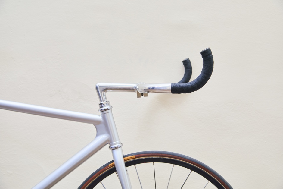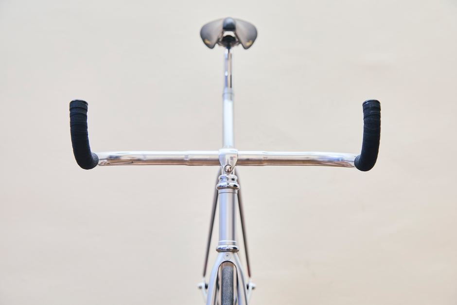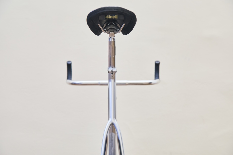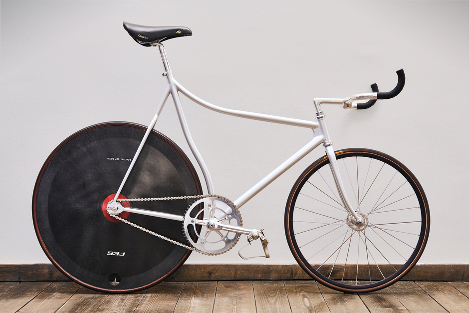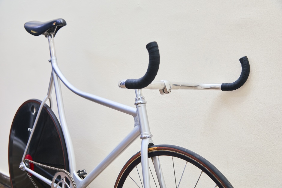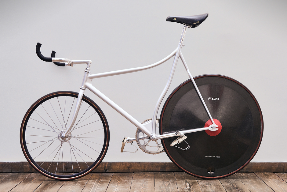 Textima Type Pursuer 27/24 – a very special Textima model from 1990 representing the final development stage and a prototype. Firstly, because not only the seat tube but also the top tube is curved. Secondly, because the reinforcement plates were added later. What does that mean? It means that this test model was used to investigate the effect of such reinforcement plates on the bending and torsion of the frame. First, the frame was measured without plates, then the tunnel plate was added to the bottom bracket. Finally, a measurement was taken with the tunnel plate and head tube plate. The result showed that the additional plate on the head tube could not make a significant contribution to reducing the bending and torsion of the frame. There was also a comparison model that was almost identical in construction. The two frames differed only in the rear triangle. The bike shown here has a monostay and the comparison model has a classic rear triangle. The bike with the classic rear triangle has slightly better values in terms of bending than the bike with the monostay. However, by adding the plates, a stiffer frame can be constructed in comparison using the monostay. (frame size and number to follow) - Textima Type Pursuer frame and fork repainted (year 2014) - Rear: 27" FES disc wheel with tubular tire - Front: 24" Textima rim with bladed spokes, Campagnolo Super Record high-flange hub with Continental tubular tire - Textima handlebars - Campagnolo Super Record headset - Campagnolo Super Record bottom bracket - Campagnolo lightweight crankset, typical of Textima - Campagnolo Super Record seatpost - Campagnolo chainring (size to follow), Wippermann chain - Campagnolo Super Record pedals - Cinelli stem (120mm length) - Cinelli Volare SLX saddle