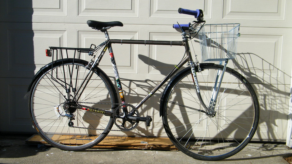 Generic Grips/ Bell/ Water-bottle mount/ Sticker(s) to cover rust/ Wald Basket Wide front/ Zip tied Flashlight/ Fenders/ Rear Rack/ Fairdale Pannier-skate-rack