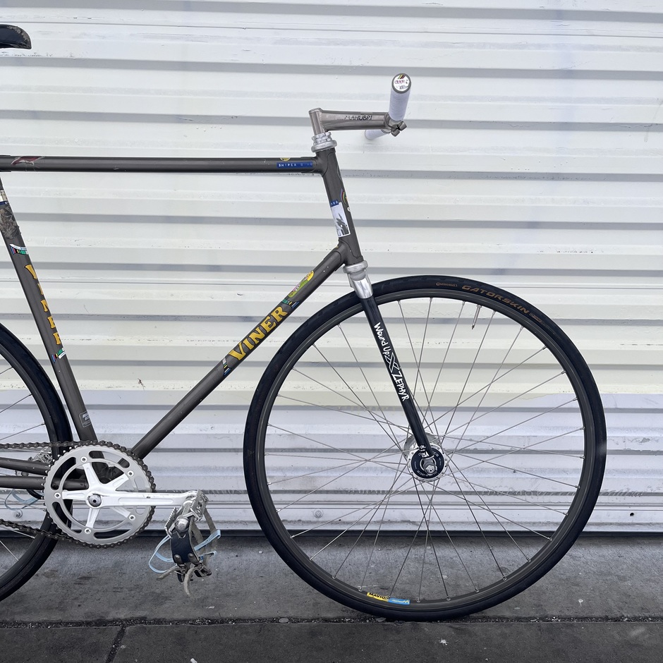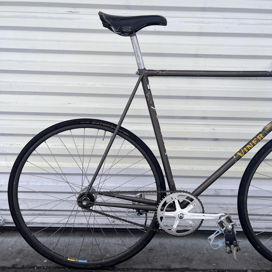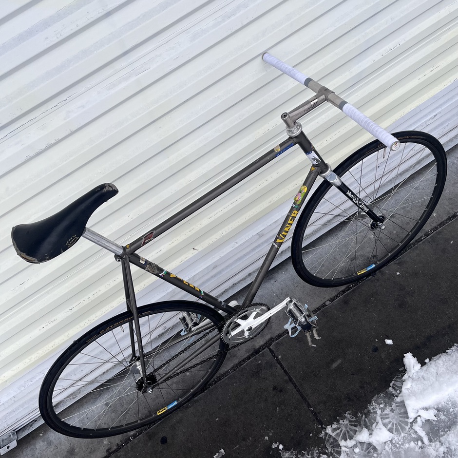 This was a frame that belonged to a good friend of mine at one point, I eventually found for sale by someone else and built it up. Ratty track bike. Gross and fast