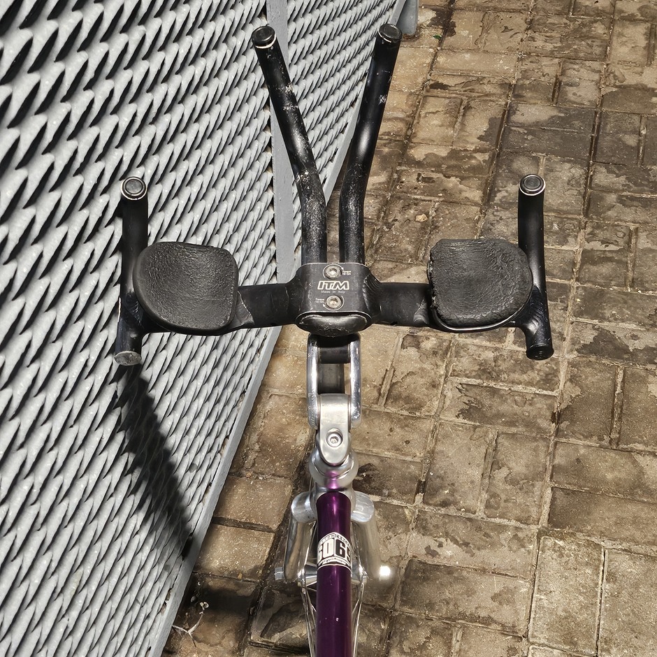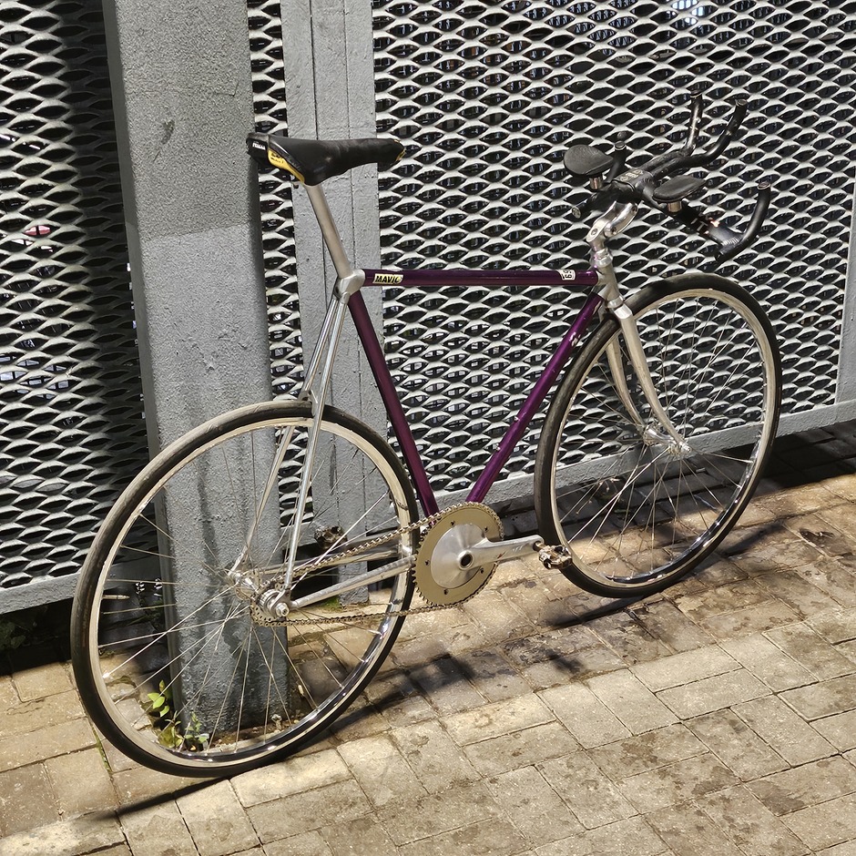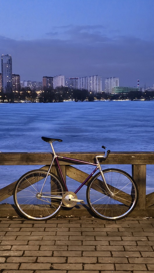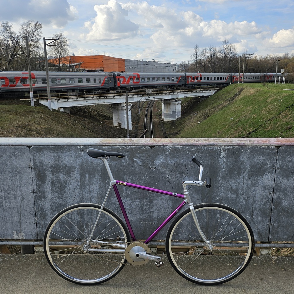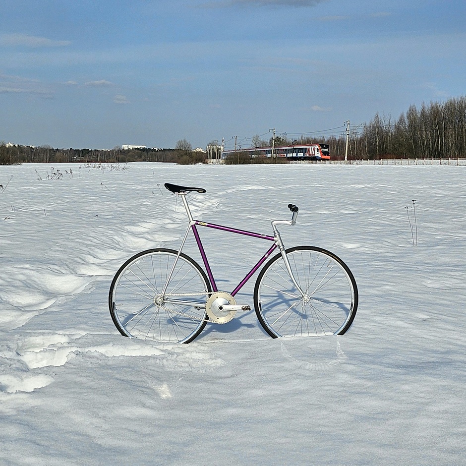 Another lo-pro in my collection. Being road-bike at birth, it came to me in a horrible condition- all the roadie elements have been savagely & nastily torn off, "thanks" to the previous owner, the anodizing is beat-up and original fork gone into the oblivion. Current setup is far from final as it mostly consists of the parts taken off the Favorit, that is living in the paint shop at the moment. The plans are to gradually bring it back to senses with lots of chrome & polished parts, but the biggest challenge is to develop & manufacture whole-new track dropouts. Then there will be some work with the top-tube, but when- no one knows. . . :*