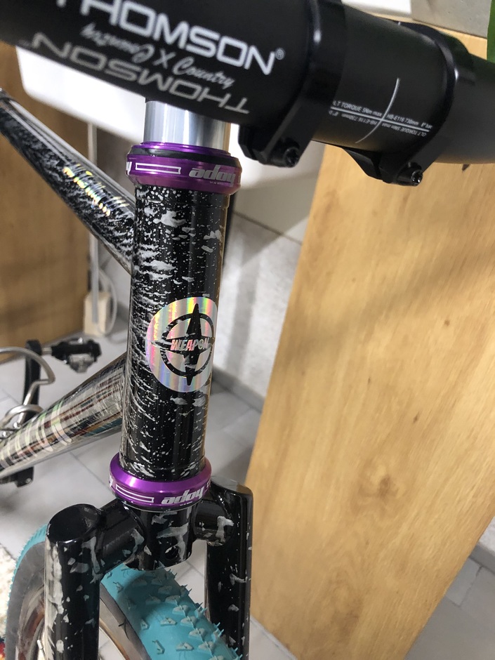 purple Hope 30mm seatclamp, Nichecycling minimalist topcap, ESI chunky grips, Loamlab counterpunches, King Cage Ti bottlecage, pro-bolt purple alloy bolts / Schwalbe Clik valves