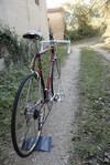 Bought for and with my friend this beautiful bike on ebay. Poor description and bad pictures lead to a good price. Seems to be fully original, ridden by a old man to work... Took everything apart, cleaned and freshly greased the bearings. New tires and tubes, new cables and outer cables, new chain, new straps, new hoods and a new handlebartape were mounted. Later the seatpost and saddle were replaced. Looking now for a more ergonomic and better looking handlebar... Love the details on this slighly simple frame! Changed in tuscany the cassette to a black, bigger and more mountain friendly one.