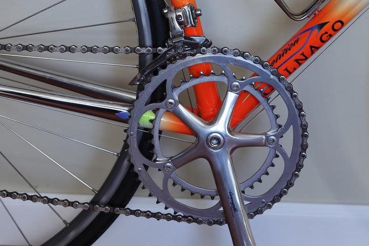 The frame was purchased years ago, and the components I bought used as a full group when I assembled the bike. The idea was to have a period correct bike but in truth the components are a few years older than the frame I believe. It's a double with a 9 speed cassette.