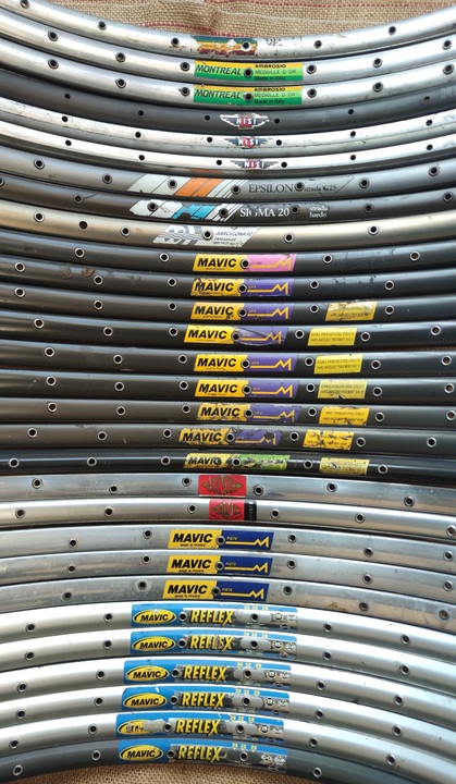 Used Mavic Piste silver rims (newer pattern sticker). Double eyelets. No wear on rim walls. 32h. 40 euros (per pair)