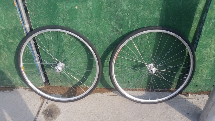 Wheels are true and spin well, but hubs would benefit from re-grease/clean up as wheels were in storage for a while.