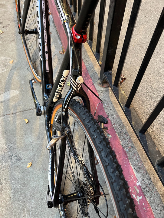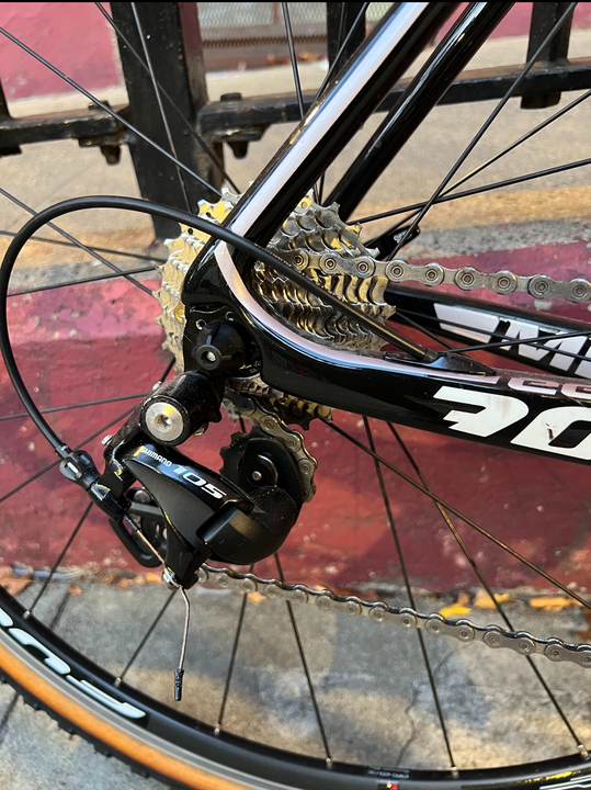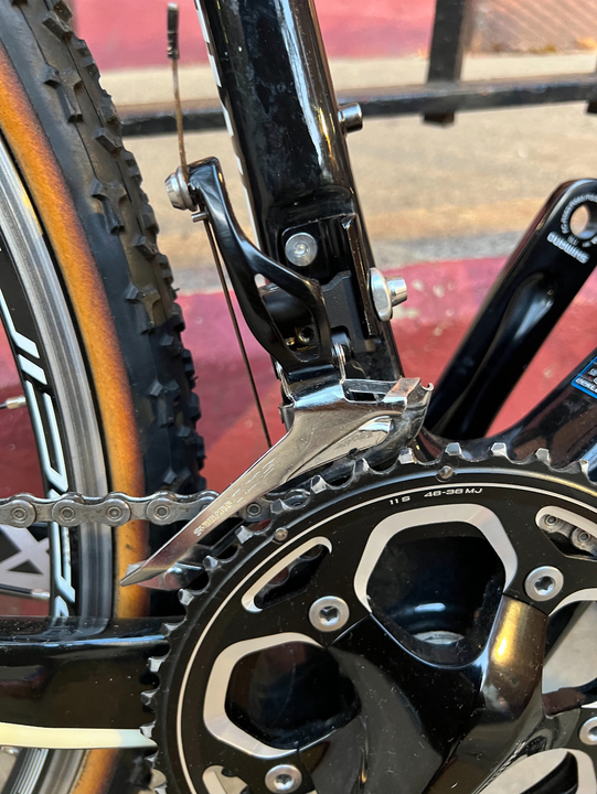 -Shimano 105 shifters & derailleurs. Shimano cantilever brakes, Shimano crankset(170 mm crank arm length). 46-36t chainrings.