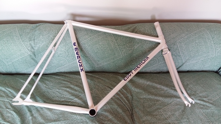 Up for sale ia a freshly restored Eddy Merckx pursuit track frame with its original track fork.