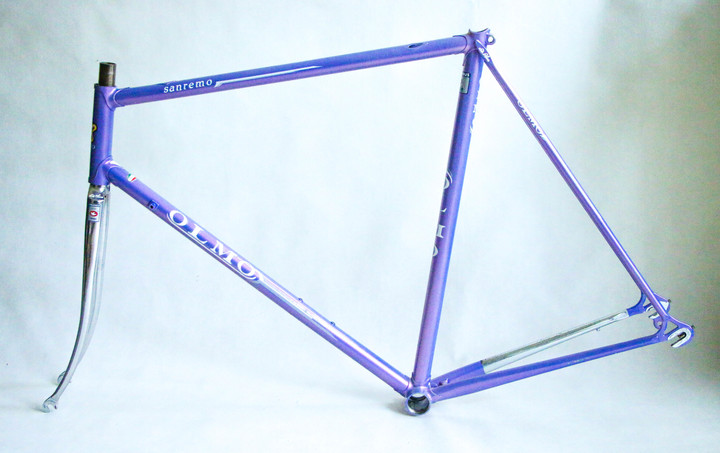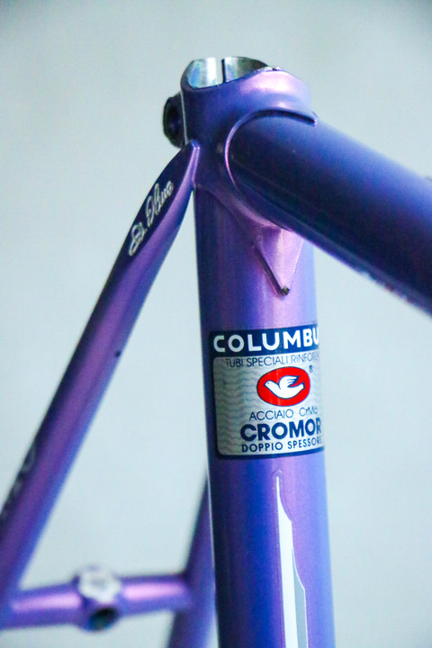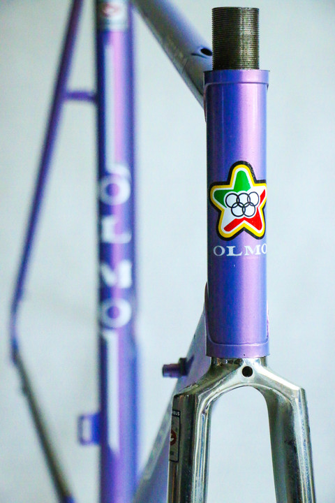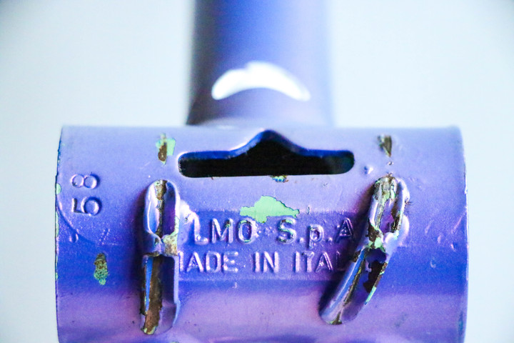 The particular Olmo Sanremo road frameset which is made from Columbus CroMor tubing is in quite good condition but has some natural signs of use from all the years as paint chipping and minimal surface corrosion around the cable area on the top tube, downtube and next to the bottom bracket shell. Other than that no dents or any other significant damage. Very nice vivid color paint scheme blue purple pearl from the 80-90s. Size 58 stamped on the bottom bracket shell.