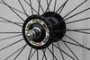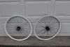 Hubs are currently laced to what i think are velocity 30mm deep V white rims. Rims are pretty used/scratched/dirty and wheels would require truing if you were to use them as is. It looks like the hubs are much newer than rims.