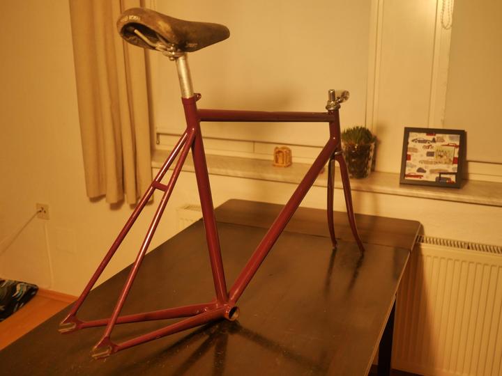 I want to sell my track frame including fork. The frame is in good condition, except of a small dent on the top tube. The color (dark purple - does not look right on the photos) is not original. I was told that the frame comes from the production of Hardo Wagner (Germany), but I can not confirm 100%. The frame height is 53cm (c-c). The frame is very light for a steel frame and has some special features (including seat post attachment, slim fork - reminiscent of TEXTIMA). Seat, seat post and stem is not included in the offer, but can be given if interested and surcharge.