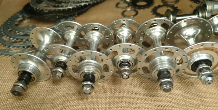 Suntour Superbe Pro NJS track high flange hub set front and rear hub. 32h. Spins smoothly. No play. New nuts. Some more wear to stickers. 100mm and 120mm - 240 euros