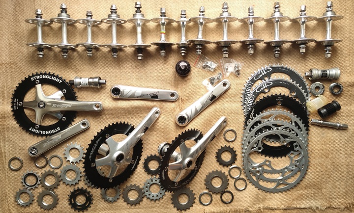 Stronglight Track 2000 fixed gear track fixie single speed crankset. 144BCD. 165mm crankarms length. Comes with Stronglight 144BCD 49t 1/8" chainring. Comes with Shimano BB-UN55 BSA BB 1.37x24 threaded bottom bracket. With self extracting bolts. Good condition with minimal and natural signs of use - 160 euros