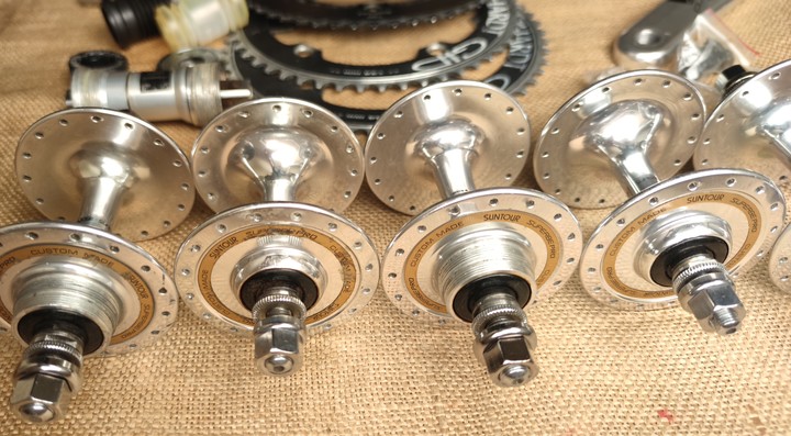 Suntour Superbe Pro NJS track high flange hub set front and rear hub. 32h. Spins smoothly. No play. New nuts. Some more wear to stickers. 100mm and 120mm - 240 euros
