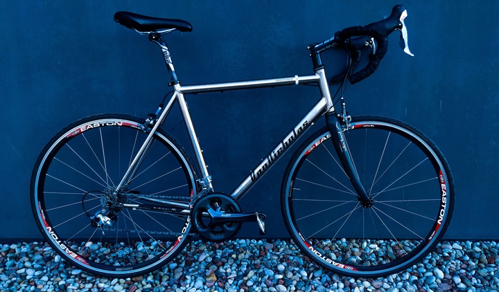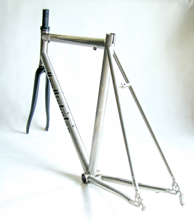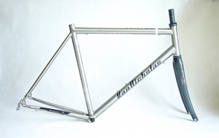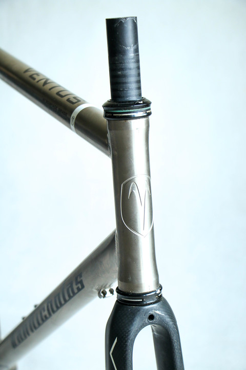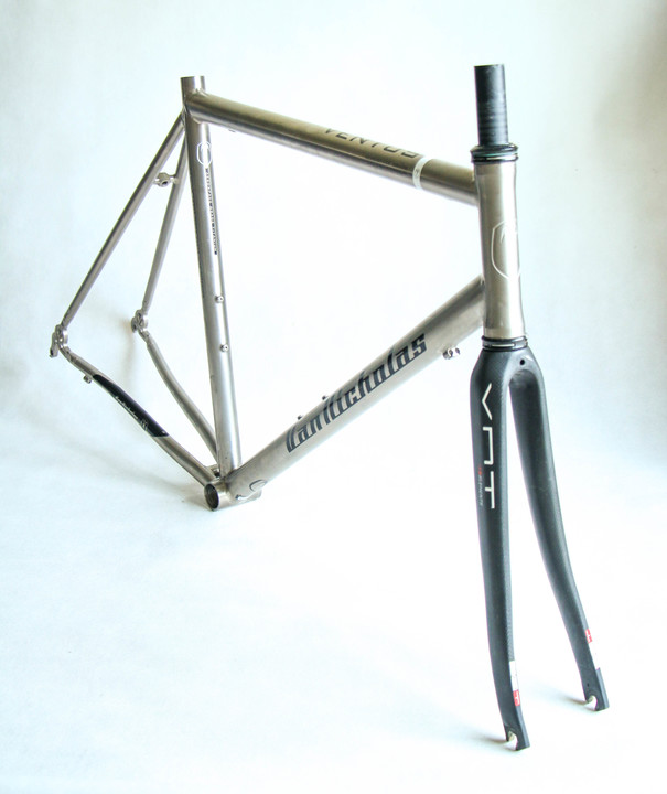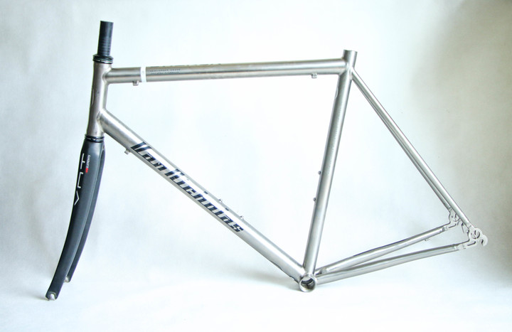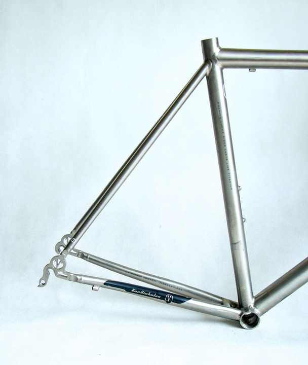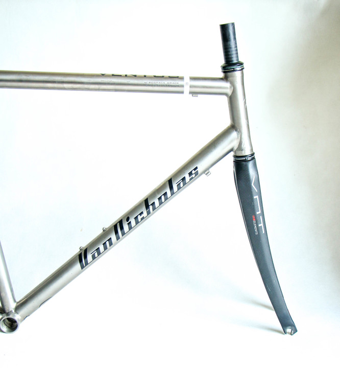 For sale Van Nicholas Ventus SE (Special Edition) a good looking titanium frameset with a slightly sloping top tube and classic narrow gauge tubing. The 3AL/2.5V frame with straight gauge tubes delivers a comfortable ride and positions this frame as a stayer more than a sprinter; qualities that are borne out on the road. Comes with inhouse made Van Nicholas VNT 1 1/8" carbon fork.